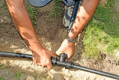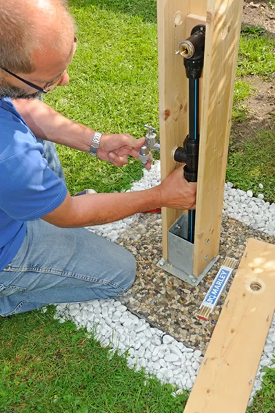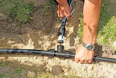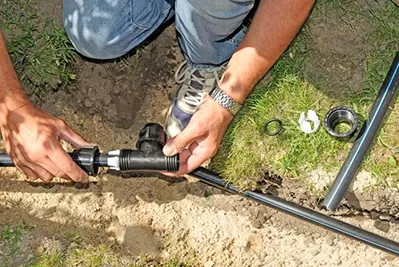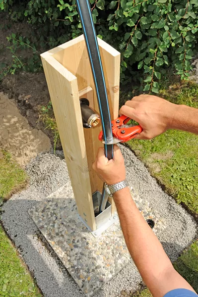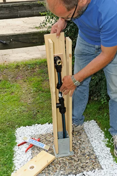 На участке мы делаем несколько точек водоразбора. Для того чтобы сделать отвитления для колонки мы установим тройник. Расстояние от тройника до места установки колонки измеряем рулеткой.