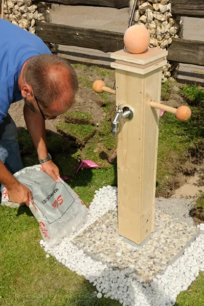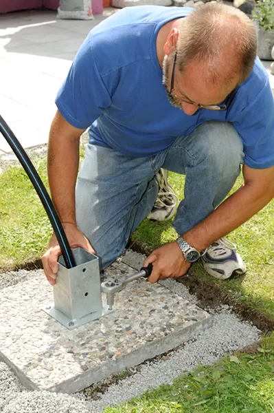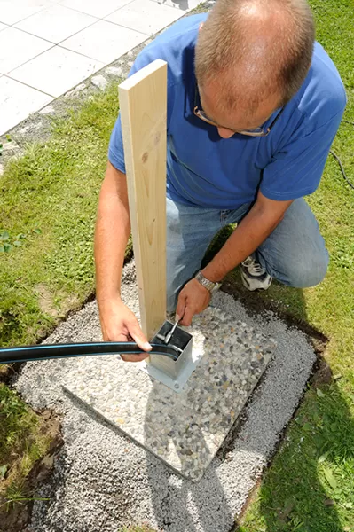 Крепим станину с помощью винтов с резьбой (M8) на тротуарной плитке. Основание колонки мы изготовили из листового металла.