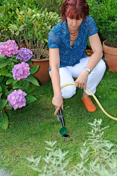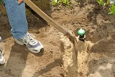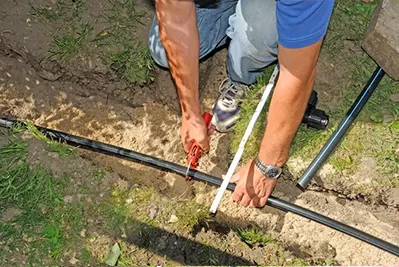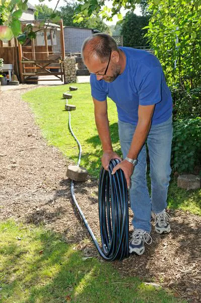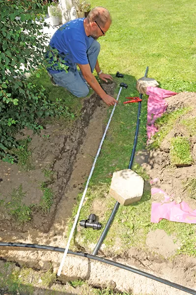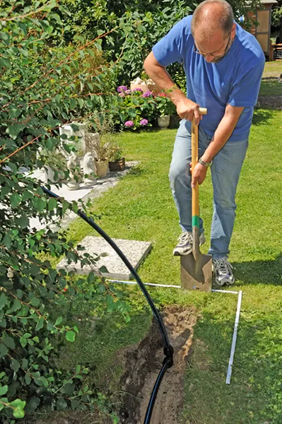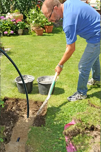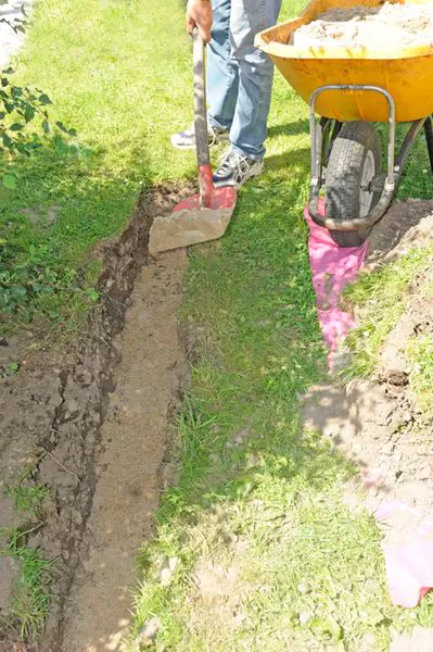 Для укладки трубопровода выкапываем траншею глубиной от 30 до 35 см и наполовину засыпьте ее песком, чтобы трубу не повредили камни.