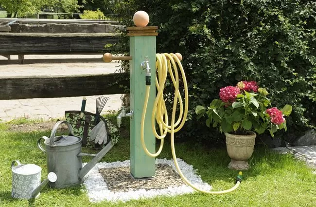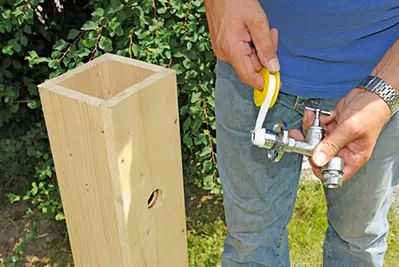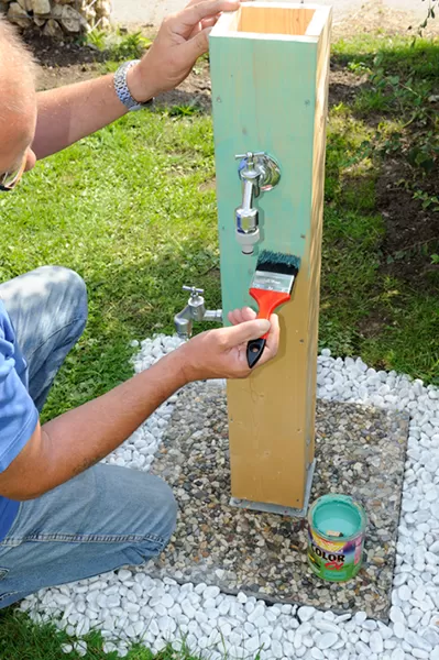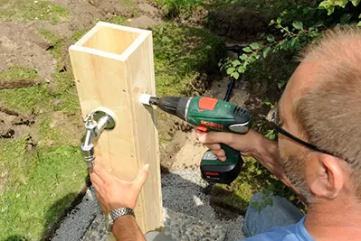 Просверлите боковые стенки немного выше водоразборного крана для дальнейшего крепления под поливочного шланга.