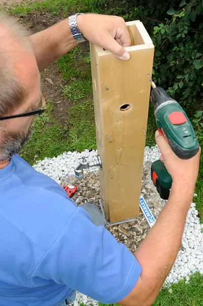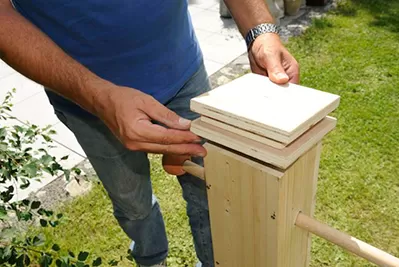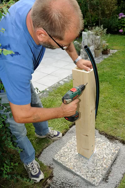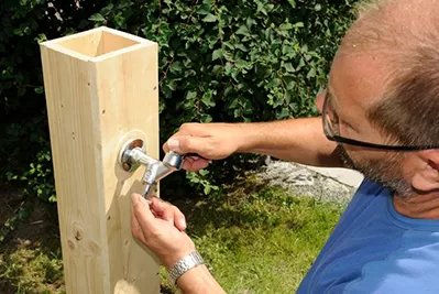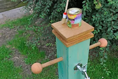 Верхнюю часть нашей колонки мы закрываем крышкой. В просверленное ранее отверстие вставляем перекладину, на нее мы будем подвешивать наш садовый шланг.
