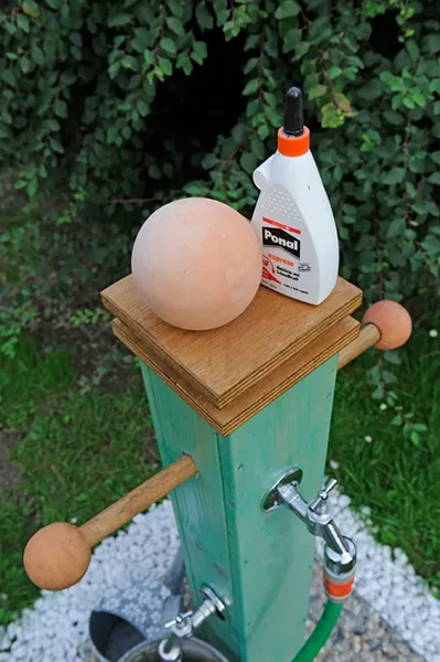 С помощью водостойкого клея для дерева декорируем нашу колонку шарами из дерева.