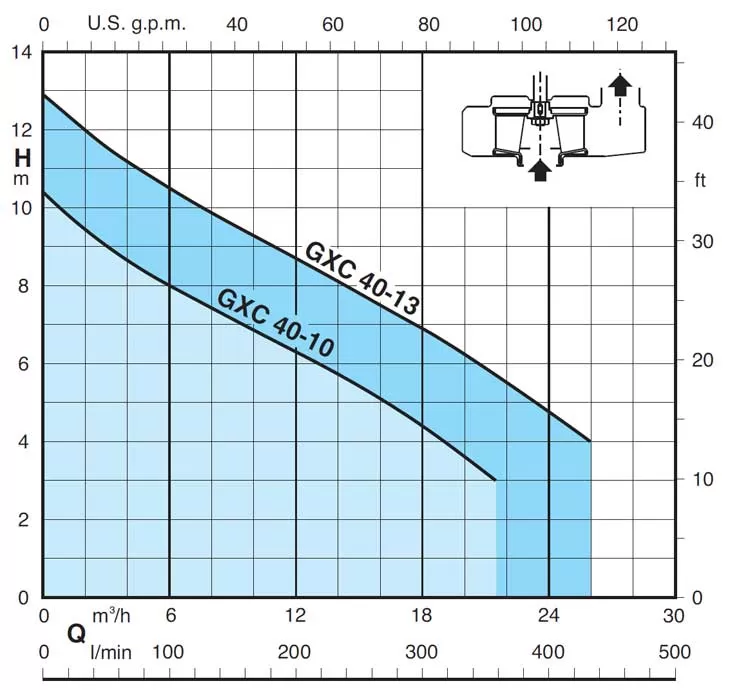 Насос Calpeda GXC 40-13 - это погружной дренажный электронасос, оборудованный двухканальным рабочим колесом и рассчитанный на откачку из водоемов, скважин и затопленных помещений грязной воды с твердыми или волокнистыми частицами размером до 35 мм. Модель производится из нержавеющей хромо - никелевой стали, что дает антикоррозионную защиту при погружении от 0,25 до 5 метров и гладкие, удобные для чистки поверхности конструкции. Это позволяет использовать насос в пищевой промышленности. Показатели производительности: оптимальная рабочая точка 15,0 кубометров в час (250 литров в минуту) при давлении 7,8 метра водяного столба. КПД насоса в указанной точке 38 %. Общая производительность колеблется от 3,0 до 26,0 кубометров в час (от 50,0 до 433,0 литров в минуту), при напоре от 4,0 до 11,6 метра водяного столба. Насос оснащен двухполюсным трехфазным электродвигателем 220/380 В, 50 Гц, 0,9 кВт, 2900 об./мин. Встроенный в коробке конденсатор. Обмотка сухая, влагоустойчивая, с тройной пропиткой, класс изоляции F, класс защиты IP 68. Длина кабеля 4 G 1 мм2 типа H07RN8-F - 10 метров. Автоматический запуск и остановка производятся поплавковым выключателем.