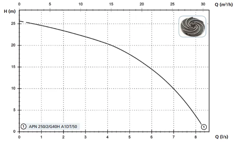 Погружной дренажный насос Zenit APN 250/2/G40H создан для контакта с атмосферной или дренажной водой, содержащей песок или другие твердые частички размером до 10 мм. Специально обработанная гидравлическая часть насоса обеспечивает выталкивание этих взвешенных частиц и предотвращает блокировку рабочего колеса. Другой особенностью конструкции является то, что два механических кремниевых уплотнения установлены в камере с маслом, имеющей простой фланцевый доступ для осмотра и обслуживания. Корпус и крыльчатка большого напора отлиты из чугуна, вал и опорная всасывающая решетка – из нержавеющей стали. Данная модель отличается комбинированным фланцевым и резьбовым напорным патрубком и успешно применяется на глубине до 20 метров для полива, в сельском хозяйстве, в решении бытовых вопросов, для устройства декоративных фонтанов. Гидравлические характеристики: показатели производительности имеют диапазон от 3,6 до 28,8 м3 в час (от 60,0 до 480,0 л/мин), при напоре от 3,7 до 24,6 м водяного столба; оптимальная рабочая точка 18,0 м3/час (4800 л/мин) при давлении 17,9 м водяного столба, с КПД равным 63 %. Насос сконструирован на базе экологического электродвигателя сухого типа мощностью 1,8 кВт, 2900 об/мин в двух вариантах: с напряжением 220 В, силой тока 12,5 А и напряжением 380 В, силой тока 4,3 А.