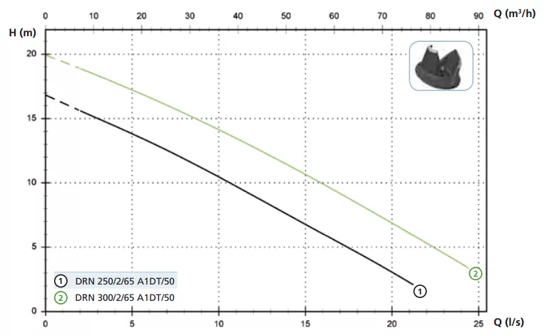 Дренажный погружной электронасос Zenit DRN 300/2/65 создан для применения в промышленности, очистных сооружениях, канализации, сельском хозяйстве и особенно подходит для грязной воды с твердыми взвешенными частицами до 40 мм. В чугунном корпусе смонтированы: электродвигатель, сопряженный с чугунной открытой многоканальной крыльчаткой через два механических уплотнения, размещенные в большой осматриваемой камере с маслом, и защитная система от засорения, предотвращающая механическую блокировку рабочего колеса. Насос откачивает воду (с глубины до 20 м) через горизонтальный фланцевый напорный патрубок типа DN65 PN10-16 - 2 полюса. Гидравлические характеристики: оптимальная рабочая точка 57,6 м3 в час (9600 л/мин) при давлении 9,9 м водяного столба. КПД насоса в указанной точке 72 %. Общая величина производительности колеблется от 14,4 до 86,4 м3 в час (от 240,0 до 1440,0 л/минуту), при напоре от 3,7 до 17,8 м водяного столба. Экологический электродвигатель сухого типа, мощностью 2,2 кВт и напряжением 380 В, рассчитан на 30 запусков в час. Вал двигателя имеет специальную бронзовую втулку, совмещенную с коническим валом, которая восстанавливает сопряжение крыльчатки, сохраняя показатели производительности насоса.