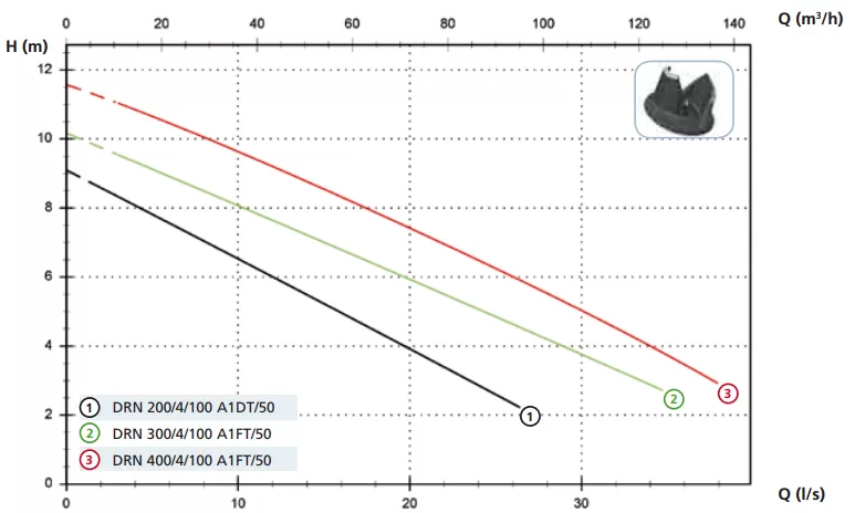 Дренажный погружной электронасос Zenit DRN 400/4/100 создан для применения в промышленности, очистных сооружениях, канализации, сельском хозяйстве и особенно подходит для грязной воды с твердыми взвешенными частицами до 80 мм. В чугунном корпусе смонтированы: электродвигатель, сопряженный с чугунной открытой многоканальной крыльчаткой через два механических уплотнения, размещенные в большой осматриваемой камере с маслом, и защитная система от засорения, предотвращающая механическую блокировку рабочего колеса. Насос откачивает воду (с глубины до 20 м) через горизонтальный фланцевый напорный патрубок типа DN100 PN10-16 - 4 полюса. Гидравлические характеристики: оптимальная рабочая точка 72,0 м3 в час (1200 л/мин) при давлении 7,4 м водяного столба. КПД насоса в указанной точке 58 %. Общая величина производительности колеблется от 14,4 до 129,6 м3 в час (от 240,0 до 2160,0 л/минуту), при напоре от 3,5 до 10,9 м водяного столба. Экологический электродвигатель сухого типа, мощностью 3,0 кВт и напряжением 380 В, рассчитан на 30 запусков в час. Вал двигателя имеет специальную бронзовую втулку, совмещенную с коническим валом, которая восстанавливает сопряжение крыльчатки, сохраняя показатели производительности насоса.