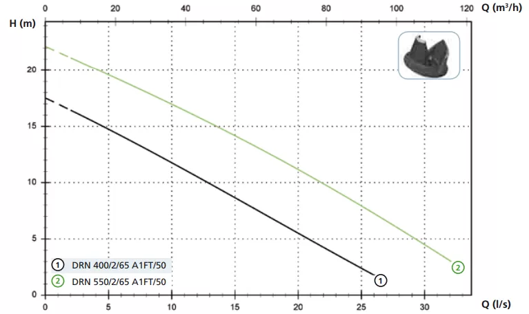 Дренажный погружной электронасос Zenit DRN 550/2/65 создан для применения в промышленности, очистных сооружениях, канализации, сельском хозяйстве и особенно подходит для грязной воды с твердыми взвешенными частицами до 50 мм. В чугунном корпусе смонтированы: электродвигатель, сопряженный с чугунной открытой многоканальной крыльчаткой через два механических уплотнения, размещенные в большой осматриваемой камере с маслом, и защитная система от засорения, предотвращающая механическую блокировку рабочего колеса. Насос откачивает воду (с глубины до 20 м) через горизонтальный фланцевый напорный патрубок типа DN65 PN10-16 - 2 полюса. Гидравлические характеристики: оптимальная рабочая точка 57,6 м3 в час (960 л/мин) при давлении 13,6 м водяного столба. КПД насоса в указанной точке 59 %. Общая величина производительности колеблется от 14,4 до 115,2 м3 в час (от 240,0 до 1920,0 л/минуту), при напоре от 3,1 до 20,1 м водяного столба. Экологический электродвигатель сухого типа, мощностью 4,1 кВт и напряжением 380 В, рассчитан на 30 запусков в час. Вал двигателя имеет специальную бронзовую втулку, совмещенную с коническим валом, которая восстанавливает сопряжение крыльчатки, сохраняя показатели производительности насоса.
