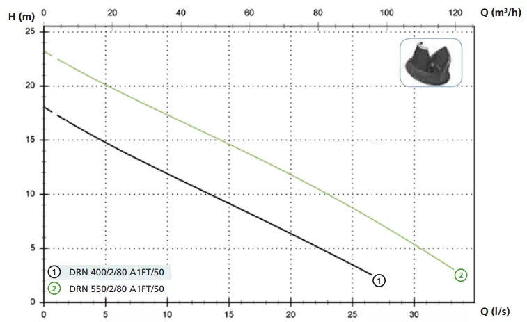 Дренажный погружной электронасос Zenit DRN 550/2/80 создан для применения в промышленности, очистных сооружениях, канализации, сельском хозяйстве и особенно подходит для грязной воды с твердыми взвешенными частицами до 45 мм. В чугунном корпусе смонтированы: электродвигатель, сопряженный с чугунной открытой многоканальной крыльчаткой через два механических уплотнения, размещенные в большой осматриваемой камере с маслом, и защитная система от засорения, предотвращающая механическую блокировку рабочего колеса. Насос откачивает воду (с глубины до 20 м) через горизонтальный фланцевый напорный патрубок типа DN80 PN10-16 - 2 полюса. Гидравлические характеристики: оптимальная рабочая точка 57,6 м3 в час (960 л/мин) при давлении 14,1 м водяного столба. КПД насоса в указанной точке 62 %. Общая величина производительности колеблется от 14,4 до 115,2 м3 в час (от 240,0 до 1440,0 л/минуту), при напоре от 3,9 до 20,7 м водяного столба. Экологический электродвигатель сухого типа, мощностью 4,1 кВт и напряжением 380 В, рассчитан на 30 запусков в час. Вал двигателя имеет специальную бронзовую втулку, совмещенную с коническим валом, которая восстанавливает сопряжение крыльчатки, сохраняя показатели производительности насоса.