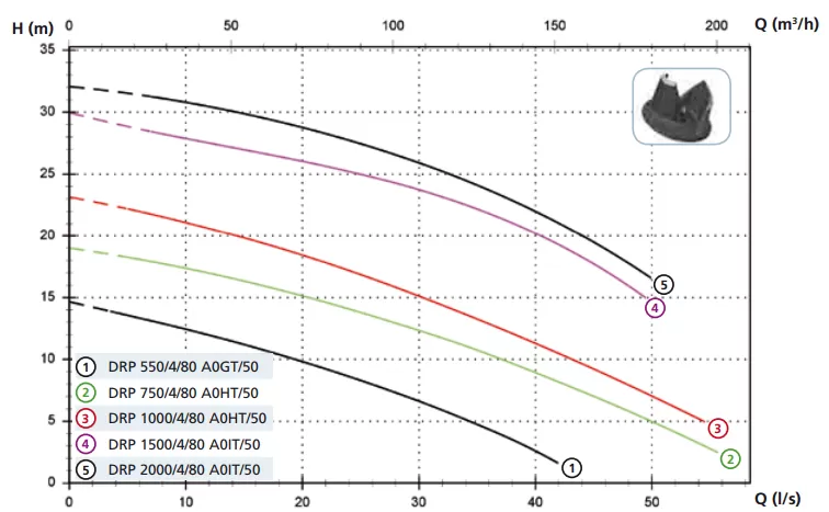 Электронасос Zenit DRP 2000/4/80 A0IT/50 является одним из самых мощных дренажных погружных насосов в серии DR. Свободный интегральный просвет 50 x 70 мм обеспечивает выброс (через горизонтальный фланцевый патрубок) очень грязной воды с твердыми телами и другими активными осадками, не допуская блокировки рабочего колеса. Именно поэтому, данную модель лучше всего применять в очистных сооружениях, системах канализации, установках для подъема стоков и им подобных устройствах. Корпус насоса и многоканальная открытая крыльчатка изготовлены из чугуна, вал отлит из нержавеющей стали. Для продления срока службы три механических уплотнения помещены в большую масляную камеру. Гидравлические характеристики: оптимальная рабочая точка 108,0 м3/час (1800 л/мин) при давлении 25,9 м водяного столба и с КПД равным 57 %. Общая величина производительности колеблется от 36,0 до 144,0 м3 в час (от 600,0 до 2400,0 л/минуту), при напоре от 22,0 до 30,8 м водяного столба. В насосе установлен трехфазный электродвигатель мощностью 16,4 кВт и напряжением 380 В, помещенный в масляную ванну с тепловой защитой.