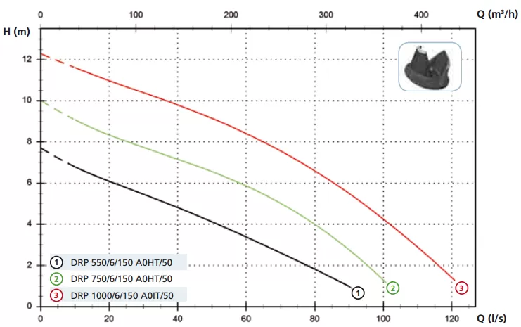 Электронасос Zenit DRP 550/6/150 A0HT/50 является одним из самых мощных дренажных погружных насосов в серии DR. Свободный интегральный просвет 115 мм обеспечивает выброс (через горизонтальный фланцевый патрубок) очень грязной воды с твердыми телами и другими активными осадками, не допуская блокировки рабочего колеса. Именно поэтому, данную модель лучше всего применять в очистных сооружениях, системах канализации, установках для подъема стоков и им подобных устройствах. Корпус насоса и многоканальная открытая крыльчатка изготовлены из чугуна, вал отлит из нержавеющей стали. Для продления срока службы три механических уплотнения помещены в большую масляную камеру. Гидравлические характеристики: оптимальная рабочая точка 216,0 м3/час (4800 л/мин) при давлении 3,4 м водяного столба и с КПД равным 51 %. Общая величина производительности колеблется от 36,0 до 324,0 м3 в час (от 600,0 до 5400,0 л/минуту), при напоре от 1,0 до 6,8 м водяного столба. В насосе установлен трехфазный электродвигатель мощностью 4,1 кВт и напряжением 380 В, помещенный в масляную ванну с тепловой защитой.