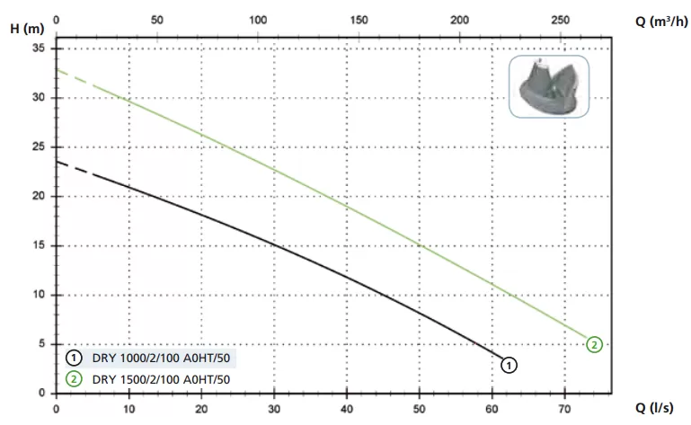 Погружной дренажный электронасос Zenit DRY 1500/2/100 AOHT-E представляет собой электромеханическую конструкцию из специальных сплавов, выдерживающих воздействие коррозийной агрессивной (соляной, кислотной) среды, прежде всего, в химическом производстве. Большой свободный интегральный просвет предотвращает блокировку крыльчатки, выбрасывая песок, волокнистые и твердые частицы до 80 мм. Три механических уплотнения между электродвигателем и крыльчаткой помещены в осматриваемую масляную камеру, что увеличивает их срок эксплуатации. Насос рассчитан на 30 запусков в час на глубине до 20 метров. Гидравлические характеристики: оптимальная рабочая точка 144,0 м3/ч (2400л/мин.) при напоре 18,8 м вод. столба. Показатели производительности колеблются от 20,0 до 262,0 м3/час (333,3 - 4366,7 л/мин.) при напоре от 5,6 до 31,0 м вод. столба. В насосе использован трехфазный электродвигатель в масляной ванне: мощность 15,0 кВт, 2900 об/мин, напряжение 380 В, сила тока 28,2 А.