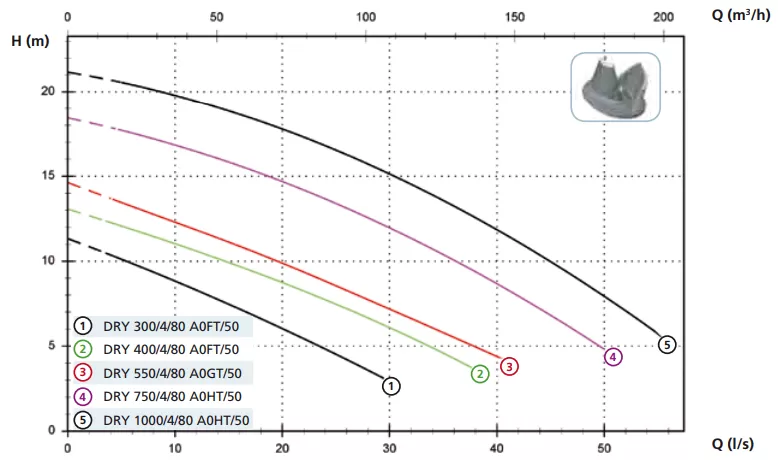 Погружной дренажный электронасос Zenit DRY 400/4/80 A0FT-E представляет собой электромеханическую конструкцию из специальных сплавов, выдерживающих воздействие коррозийной агрессивной (соляной, кислотной) среды, прежде всего, в химическом производстве. Большой свободный интегральный просвет предотвращает блокировку крыльчатки, выбрасывая песок, волокнистые и твердые частицы до 67 мм. Три механических уплотнения между электродвигателем и крыльчаткой помещены в осматриваемую масляную камеру, что увеличивает их срок эксплуатации. Насос рассчитан на 30 запусков в час на глубине до 20 метров. Гидравлические характеристики: оптимальная рабочая точка 72,0 м3/ч (1200 л/мин.) при напоре 10,7 м вод. столба. Показатели производительности колеблются от 13,0 до 136,0 м3/час (216,7 - 2266,7 л/мин.) при напоре от 3,5 до 12,3 м вод. столба. В насосе использован трехфазный электродвигатель в масляной ванне: мощность 3,0 кВт, 2900 об/мин, напряжение 380 В, сила тока 7,9 А.