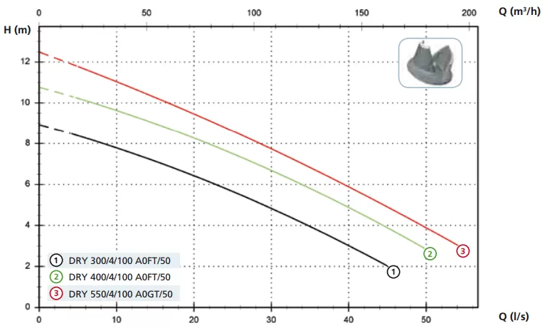 Погружной дренажный электронасос Zenit DRY 550/4/100 AOGT-E представляет собой электромеханическую конструкцию из специальных сплавов, выдерживающих воздействие коррозийной агрессивной (соляной, кислотной) среды, прежде всего, в химическом производстве. Большой свободный интегральный просвет предотвращает блокировку крыльчатки, выбрасывая песок, волокнистые и твердые частицы до 76 мм. Три механических уплотнения между электродвигателем и крыльчаткой помещены в осматриваемую масляную камеру, что увеличивает их срок эксплуатации. Насос рассчитан на 30 запусков в час на глубине до 20 метров. Гидравлические характеристики: оптимальная рабочая точка 108,0 м3/ч (180л/мин.) при напоре 7,6 м вод. столба. Показатели производительности колеблются от 20,0 до 195,0 м3/час (333,3 - 3250,3 л/мин.) при напоре от 3,0 до 11,6 м вод. столба. В насосе использован трехфазный электродвигатель в масляной ванне: мощность 4,6 кВт, 2900 об/мин, напряжение 380 В, сила тока 10,1 А.