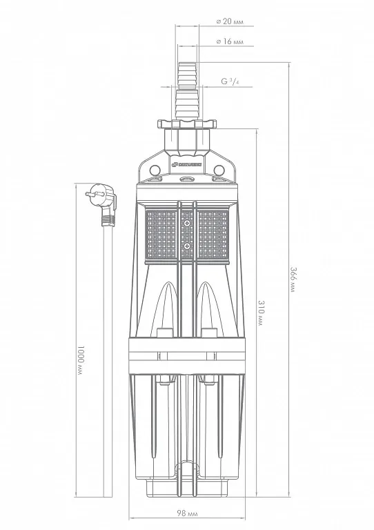 - В верхней части симметрично расположены две проушины, которые позволяют подвесить насос в строго вертикальном положении. Помимо этого из крышки насоса выходит водостойкий кабель длинной 10 м с вилкой.