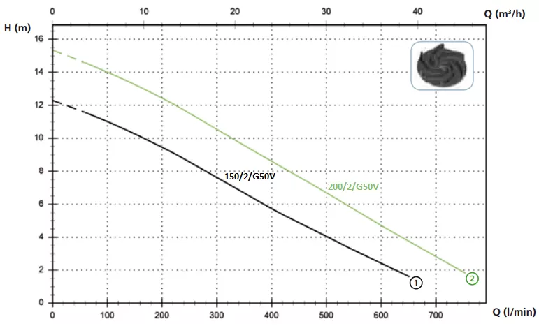 Погружной фекальный насос Zenit DG_BLUE_P_200/2/G50V может перекачивать канализационные воды с содержанием твердых и волокнистых частиц. Этот насос может использоваться в сельском хозяйстве, промышленности, а так же для бытовых нужд. Модель имеет чугунный корпус синего цвета и чугунную вихревую крыльчатку (Vortex). Глубоко посаженное рабочее колесо снижает КПД насоса, но зато дает возможность перекачивать длинные и волокнистые включения без риска, что они намотаются на рабочее колесо и заблокируют его. Свободный проход твердых частиц до 50 мм. У насоса вертикальный резьбовой патрубок 2” (50мм) и удобная рукоятка из прочного пластика. Внутри, в масляную камеру, установлены два механических уплотнения из карбида кремния. Третье сальниковое V-образное уплотнение непосредственно контактирует с жидкостью. Насос устанавливается на грунт на встроенную опору из чугуна. Максимальная глубина погружения 20 метров. Производительность насоса колеблется от 3,6 до 43,2 м3/час (от 60 до 720 л/мин), напор от 2,5 до 14,6 метров водяного столба. При этом оптимальная рабочая точка 18 м3/час (300 л/мин) при давлении 12,2 метра водяного столба.