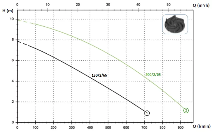 Погружной фекальный насос Zenit DGO_200/2/65 предназначен для промышленного применения в очень тяжелых условиях использования. Модель имеет чугунный корпус и чугунную крыльчатку (Vortex). Глубоко посаженное рабочее колесо снижает КПД насоса, но зато дает возможность перекачивать длинные и волокнистые включения без риска, что они намотаются на рабочее колесо и заблокируют его. Свободный проход твердых частиц до 65 мм. У насоса горизонтальный фланцевый напорный патрубок 65 мм и удобная рукоятка из нержавеющей стали. Внутри установлены два механических уплотнения, одно из карбида кремния второе из глиноземного графита, оппозитно собранных и смазывающихся маслом. Насос устанавливают на грунт на встроенную опору. Максимальная глубина погружения 20 метров. Производительность насоса колеблется от 7,2 до 50,4 м3/час (от 120 до 840 л/мин), напор от 2,5 до 9,4 метров водяного столба. При этом оптимальная рабочая точка 28,8 м3/час (480 л/мин) при давлении 6,9 метра водяного столба.