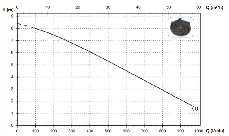 Погружной фекальный насос Zenit DGO_200/2/80 предназначен для промышленного применения в очень тяжелых условиях использования. Модель имеет чугунный корпус и чугунную крыльчатку (Vortex). Глубоко посаженное рабочее колесо снижает КПД насоса, но зато дает возможность перекачивать длинные и волокнистые включения без риска, что они намотаются на рабочее колесо и заблокируют его. Свободный проход твердых частиц до 80 мм. У насоса горизонтальный фланцевый напорный патрубок 80 мм и удобная рукоятка из нержавеющей стали. Внутри установлены два механических уплотнения, одно из карбида кремния второе из глиноземного графита, оппозитно собранных и смазывающихся маслом. Насос устанавливают на грунт на встроенную опору. Максимальная глубина погружения 20 метров. Производительность насоса колеблется от 7,2 до 50,4 м3/час (от 120 до 840 л/мин), напор от 2,5 до 9,4 метров водяного столба. При этом оптимальная рабочая точка 28,8 м3/час (480 л/мин) при давлении 6,9 метра водяного столба.