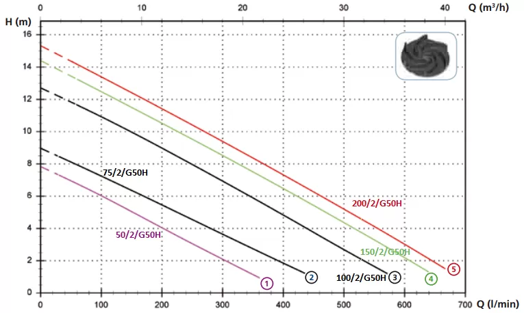 Погружной фекальный насос Zenit DGO_200/2/G50H предназначен для промышленного применения в очень тяжелых условиях использования. Модель имеет чугунный корпус и чугунную крыльчатку (Vortex). Глубоко посаженное рабочее колесо снижает КПД насоса, но зато дает возможность перекачивать длинные и волокнистые включения без риска, что они намотаются на рабочее колесо и заблокируют его. Свободный проход твердых частиц до 50 мм. У насоса горизонтальный резьбовой патрубок 2” (50мм) и удобная рукоятка из нержавеющей стали. Внутри установлены два механических уплотнения, одно из карбида кремния второе из глиноземного графита, оппозитно собранных и смазывающихся маслом. Насос устанавливают на грунт на встроенную опору. Максимальная глубина погружения 20 метров. Производительность насоса колеблется от 7,2 до 36 м3/час (от 120 до 600 л/мин), напор от 3 до 13 метров водяного столба. При этом оптимальная рабочая точка 21,6 м3/час (360 л/мин) при давлении 8,2 метра водяного столба.