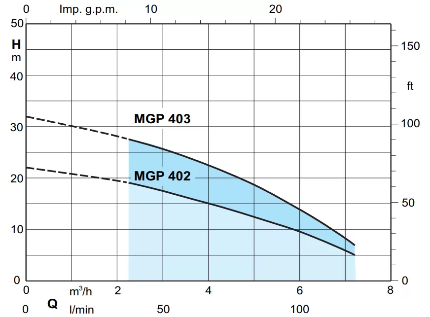 Насос Calpeda MGPM 403 - это моноблочный горизонтальный повысительный насос для использования в системах промышленного и бытового водоснабжения и орошения. Производится итальянской компанией Calpeda на севере Италии. Насос имеет 3 рабочие ступени. Патрубки насоса равнозначного диаметра 25/25 мм (всасывающий/подающий). Агрегат имеет чугунный корпус, крышка корпуса и вал насоса выполнены из нержавейки AISI 304/AISI 430, ступени и рабочие колеса из норила (PPO-GF20). Производительность двухступенчатого MGPM 403 колеблется от 2,25 до 7,2 м3/час (от 37,5 до 120,0 л/мин.), а напор соответственно от 7,0 до 27,5 метров водяного столба. При этом оптимальная рабочая точка производительности у данной модели насоса 4,0 м3/ч (66,6 л/мин.) при давлении 22,0 метра водяного столба. КПД насоса в указанной точке составляет около 45%.