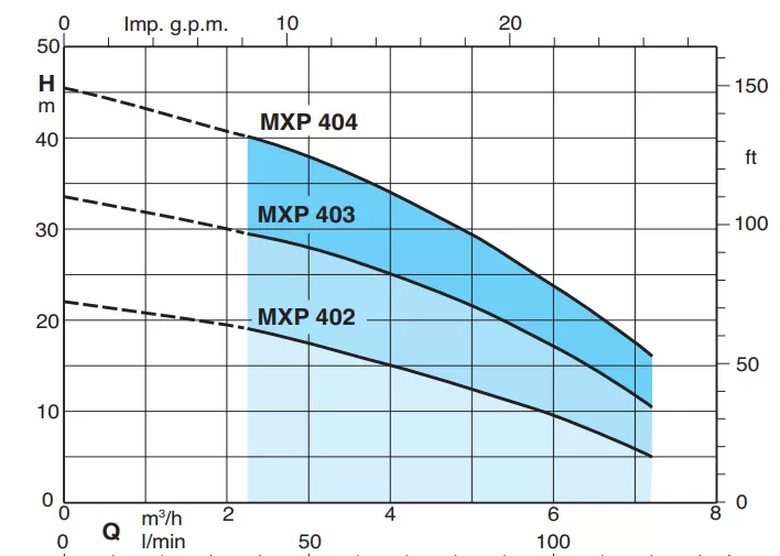 Насос Calpeda MXРM 404 - это моноблочный многоступенчатый насос высокого давления производства итальянского завода Calpeda. Насос имеет 4 рабочие ступени. Корпусная часть насоса выполнена из хромоникелевой нержавеющей стали AISI 304 (вал AISI 430). Агрегат предназначен для перекачивания воды и прочих жидкостей в системах водоснабжения и орошения. Производительность данной модели насоса колеблется от 2,25 до 7,2 м3/час (от 37,5 до 120,0 л/мин.), а напор соответственно от 16,0 до 40,0 метров водяного столба. При этом оптимальная рабочая точка производительности MXРM 404 составляет 5,0 м3/ч (83,3 л/мин.) при давлении 29,6 метра водяного столба. КПД насоса в указанной точке около 52%.