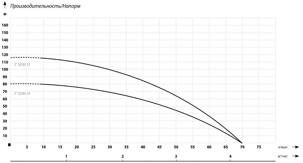IBO 3SDM 33 многоступенчатые погружной глубинный насос диаметром 75 мм, с повышенной устойчивостью к песку, рассчитаны на установку в скважину 90-125 мм. Эффект повышенной устойчивости к песку был достигнут благодаря использованию «плавающих лопастных колес» и применению износостойких рабочих элементов. Конденсатор насоса IBO 3SDM 33 встроен в двигатель, благодаря чему электрическая установка намного проще, чем в случае насосов со стартовой коробкой. Насос комплектуется кабелем 1 м. Скважинный насос IBO 3SDM 33 оснащены тепловой защитой, установленной в обмотке двигателя. Из-за частых перегревов насос может выйти из строя. Насосы имеют такую же конструкцию как и серия 3ti, однако они характеризуются более высокой производительностью до 70 л/мин. Максимальная напорная характеристика насоса составляет 117 м при мощности электродвигателя 1100 Вт. Гарантия на скважинный насос IBO 3SDM 33 составляет 2 года.