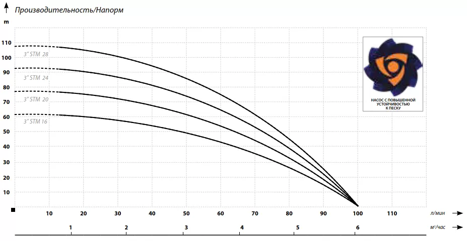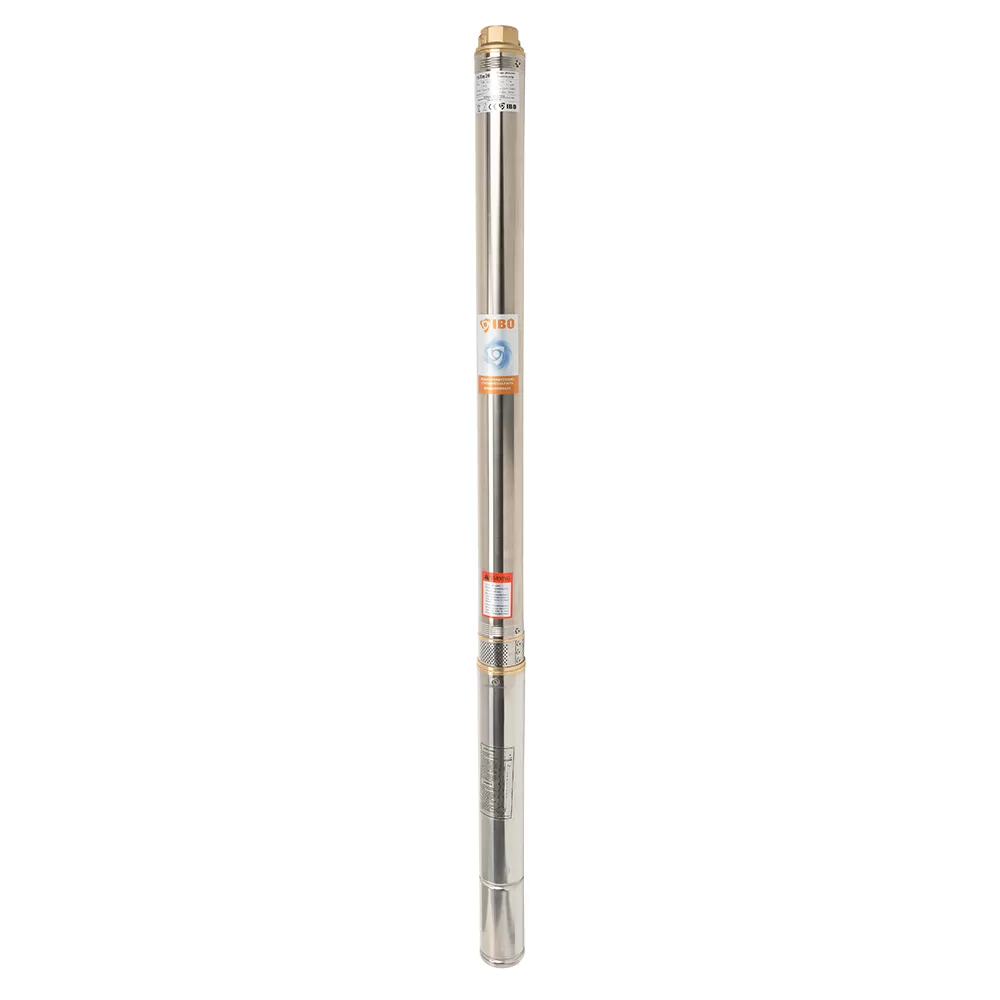 Многоступенчатые скважинный насосы диаметром 75 мм с повышенной устойчивостью к песку, рассчитанные на 3 и 4–дюймовые скважины. Насос IBO 3STM 20 обладает повышенной эффективностью к содержанию песка в перекачиваемой жидкости. Устойчивость к песку был достигнут благодаря использованию «плавающих лопастных колес» и выбору износостойких материалов. Скважинный насос IBO 3STM 20 обладает отменными характеристиками для насоса с небольшим диаметром. Максимальный напор насоса ИБО составляет 77 м, при этом максимальная производительность в пиковой точки показывает 6 м³/час. При таких напорно-расходных характеристиках мощность двигателя составляет всего 1100 Вт. Конденсатор насоса встроен в двигатель, благодаря чему электрическая установка намного проще, чем в случае насосов со стартовой коробкой. Насос оснащен тепловой защитой, установленной в обмотке двигателя. Насос комплектуется кабелем 1 м. Основным преимуществом насоса IBO 3STM 20 является чрезвычайно высокая производительность для насоса диаметром 75 мм со скоростью до 6 м³/час.