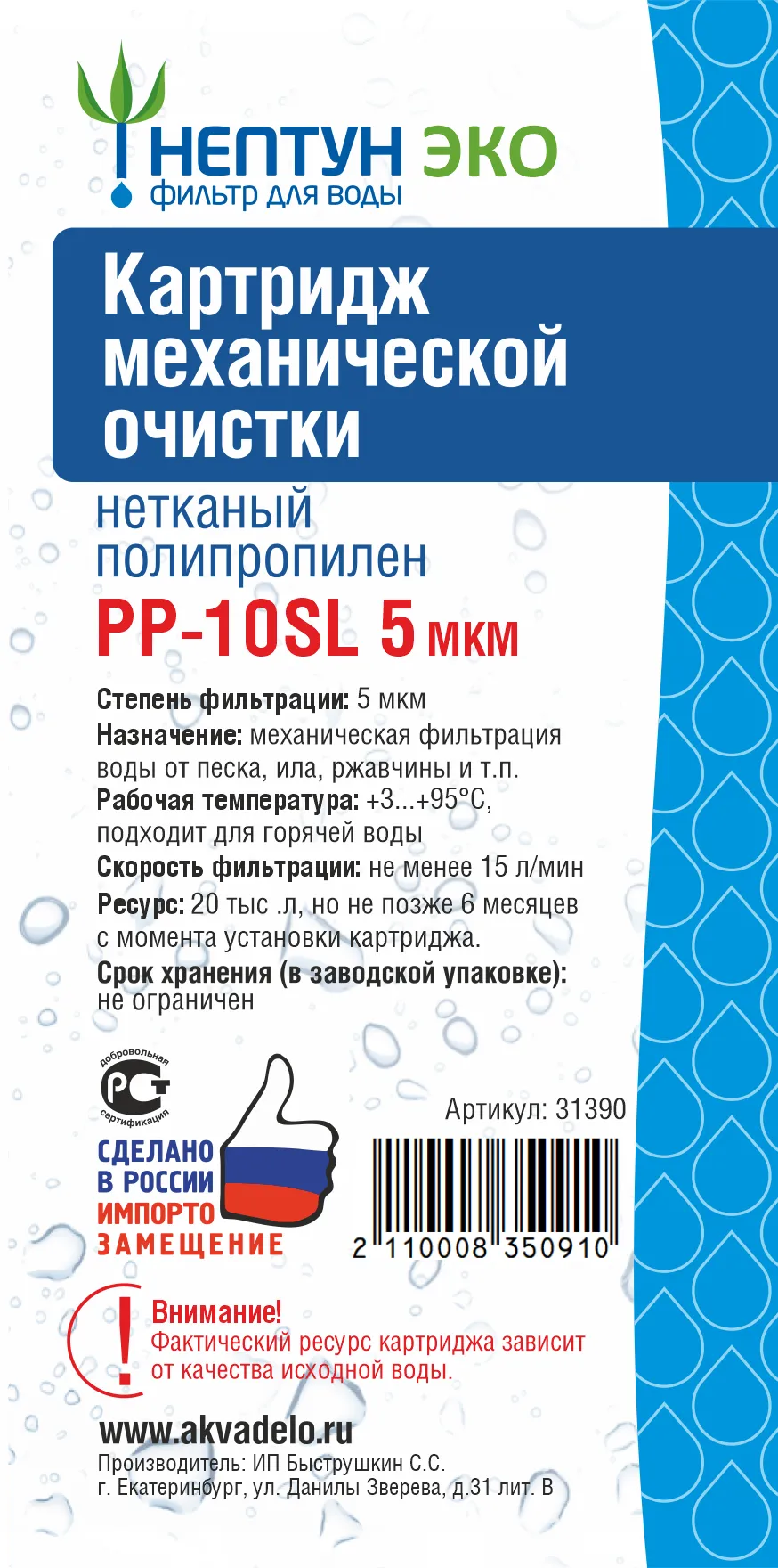 Картридж магистральный полипропиленовый «Нептун», 5 мкм, 10SL