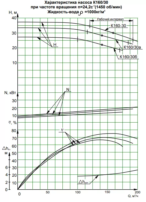 Серия К 160/30 характеризуется впечатляющими параметрами производительности. Насос способен обеспечить номинальную производительность до 160 м³/час, а максимальный напор достигает 30 метров. Это обеспечивает быструю и эффективную перекачку воды с минимальными потерями энергии. КПД насоса составляет 75%, что говорит о его энергоэффективности и экономичности в эксплуатации.