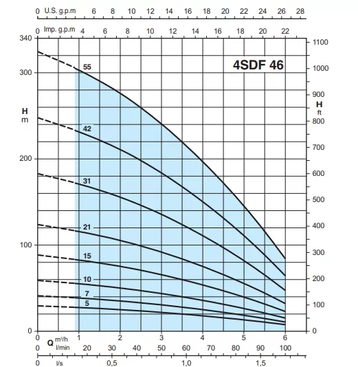 Насос Calpeda 4SDFM 46/5EC - это погружной скважинный электронасос для глубоких водяных скважин с диаметром 4 дюйма/10,16 см (DN 10 см). Плавающая радиальная конструкция рабочих колес, 5 рабочих ступеней. Корпус и вал насоса выполнены из нерж. стали AISI 304/ AISI 430 F, ступени из норила. Насос используется в промышленности и в быту, в системах автономного водопровода, для орошения полей (ирригации), в установках пожаротушения.