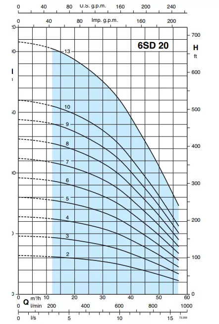 Насос Calpeda 6SD 20/2 - это погружной скважинный электронасос, предназначенный для водяных скважин диаметром 6 дюймов/15,24 см (DN 15 см). Полуосевая конструкция рабочих колес, 2 рабочие ступени. Корпус и вал выполнены из нерж. стали AISI 304/ AISI 430 F, ступени из норила. Насос используется в промышленности и в быту, в системах автономного водопровода, для орошения полей (ирригации), в установках пожаротушения. Показатели производительности: оптимальная рабочая точка 36,0 кубометров в час (600 литров в минуту) при давлении 24,6 метра водяного столба. КПД насоса в указанной точке 56%. Общая производительность колеблется от 12,0 до 57,0 кубометров в час (от 200,0 до 950,0 литров в минуту), при напоре от 11,0 до 31,0 метра водяного столба. Calpeda 6SD 20/2 оснащен электрической моделью двигателя, число оборотов - 2900 в минуту. Мощность индукционного 2-х полюсного электродвигателя 5,5 кВт. Требующееся напряжение сети 380 вольт.