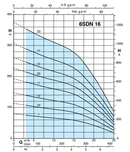 Насос Calpeda 6SDN 16/27 - это погружной скважинный электронасос, предназначенный для водяных скважин диаметром 6 дюймов/15,24 см (DN 15 см). Радиальная конструкция рабочих колес, 27 рабочих ступеней. Корпус и вал выполнены из нерж. стали AISI 304/ AISI 430 F, ступени из норила. Насос используется в промышленности и в быту, в системах автономного водопровода, для орошения полей (ирригации), в установках пожаротушения. Показатели производительности: оптимальная рабочая точка 15,0 кубометров в час (250 литров в минуту) при давлении 227,0 метров водяного столба. КПД насоса в указанной точке 69%. Общая производительность колеблется от 3,0 до 25,0 кубометров в час (от 50,0 до 416,6 литров в минуту), при напоре от 71,0 до 290,0 метров водяного столба. Calpeda 6SDN 16/27 оснащен электрической моделью двигателя, число оборотов - 2900 в минуту. Мощность индукционного 2-х полюсного электродвигателя 15,0 кВт. Требующееся напряжение сети 380 вольт.