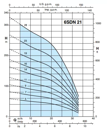 Насос Calpeda 6SDN 21/16 - это погружной скважинный электронасос, предназначенный для водяных скважин диаметром 6 дюймов/15,24 см (DN 15 см). Радиальная конструкция рабочих колес, 16 рабочих ступеней. Корпус и вал выполнены из нерж. стали AISI 304/ AISI 430 F, ступени - из норила. Насос используется в промышленности и в быту, в системах автономного водопровода, для орошения полей (ирригации), в установках пожаротушения. Показатели производительности: оптимальная рабочая точка 18,0 кубометров в час (300 литров в минуту) при давлении 143,0 метра водяного столба. КПД насоса в указанной точке 69%. Общая производительность колеблется от 5,0 до 33,0 кубометров в час (от 83,3 до 550,0 литров в минуту), при напоре от 37,0 до 173,0 метров водяного столба. Calpeda 6SDN 21/16 оснащен электрической моделью двигателя, число оборотов - 2900 в минуту. Мощность индукционного 2-х полюсного электродвигателя 15,0 кВт. Требующееся напряжение сети 380 вольт.