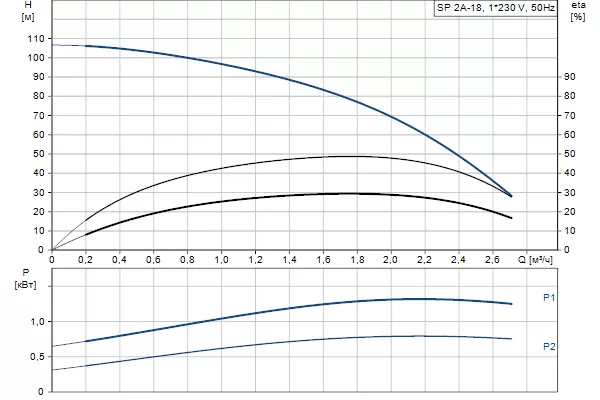 Насос Grundfos SP 2A-18 создан с применением новейших гидравлических технологий. Grundfos SP 2A-18 созданные специально для того, чтобы обеспечивать максимальную эффективность в периоды высокой нагрузки, насос имеет низкую стоимость и высокую надёжность эксплуатации вне зависимости от вида назначения. Grundfos SP 2A-18 обеспечивает высокую эффективность, высокое сопротивление абразивному износу (песку и иным абразивам), защиту от перегрева двигателя и простоту технического обслуживания. Также доступна готовая к применению система контроля и управления, предназначенная для постоянной оптимизации работы насосной системы. Максимальная производительность насоса 2.6 м3/час, максимальный напор 108 м при мощности электродвигателя 750 Вт. Насос работает от сети 220 в. Гарантийный срок на насос Grundfos SP 2A-18 составляет 2 года.