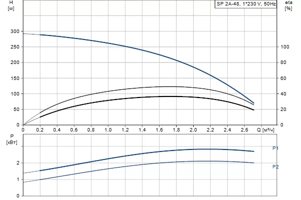 Насос Grundfos SP 2A-48 создан с применением новейших гидравлических технологий. Grundfos SP 2A-48 созданные специально для того, чтобы обеспечивать максимальную эффективность в периоды высокой нагрузки, насос имеет низкую стоимость и высокую надёжность эксплуатации вне зависимости от вида назначения. Grundfos SP 2A-48 обеспечивает высокую эффективность, высокое сопротивление абразивному износу (песку и иным абразивам), защиту от перегрева двигателя и простоту технического обслуживания. Также доступна готовая к применению система контроля и управления, предназначенная для постоянной оптимизации работы насосной системы. Максимальная производительность насоса 2.5 м3/час, максимальный напор 290 м при мощности электродвигателя 2200 Вт. Насос работает от сети 220 в. Гарантийный срок на насос Grundfos SP 2A-48 составляет 2 года.
