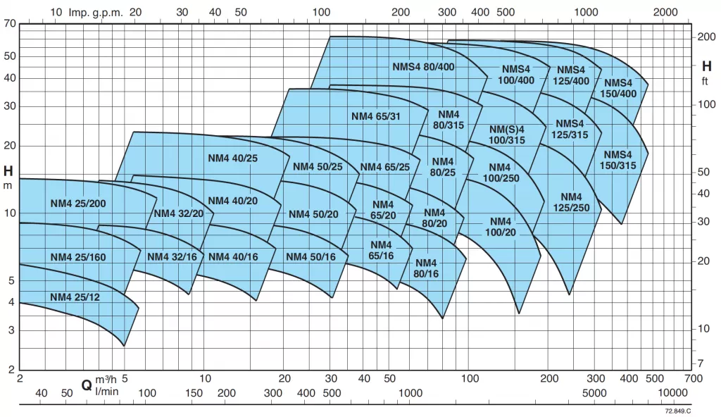 Calpeda NMS4 150/400A - это центробежный насос с фланцевым присоединением. Он позволяет перекачивать воду и прочие неагрессивные к чугуну жидкости в системах отопления и водоснабжения. Насос производится исключительно на итальянском заводе фирмы Calpeda. Производительность насоса NMS4 150/400A колеблется от 132 до 480 м3/час (от 2200 до 8000 литров в минуту), а напор соответственно от 37,5 до 59,0 метров водяного столба. При этом оптимальная рабочая точка производительности 330 м3/ч (5500 литров в минуту) при давлении 52 метра водяного столба. КПД насоса в указанной точке составляет около 77%. Насос NMS4 150/400A оснащен трехфазным (380 В) элекродвигателем 75,0 кВ, с номинальной силой тока 128,0 А.
