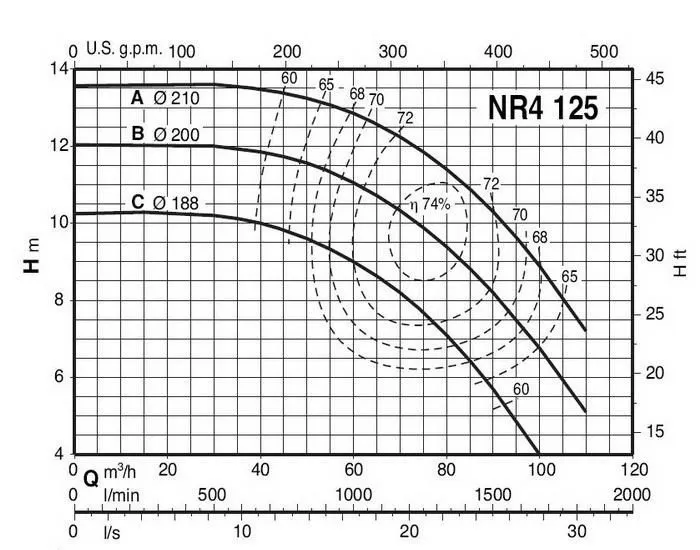 Линейный циркуляционный насос NR4 125B/A - это мощный фланцевый циркуляционный насос для систем отопления или водоснабжения. Перекачивает воду или гликолесодержащие жидкости в замкнутых системах. Патрубки насоса расположены в одну линию (inline исполнение). Производительность насоса NR4 125B/A колеблется от 30,0 до 110,0 кубометров в час (500,0 - 1840,0 литров в минуту), напор соответственно от 5,1 до 12,0 метров водяного столба. При этом оптимальная рабочая точка производительности 80,0 кубометров в час (1333,0 литров в минуту) при давлении 9,4 метра водяного столба. Показатель КПД насоса в указанной точке 74%. Манометрическая высота всасывания около 7 м. Линейный насос NR4 125B/A оснащен индукционным 4-полюсным трехфазным двигателем (n = 1450 оборотов в минуту), с номинальной мощностью 3,0 кВт (380 вольт) и силой тока соответственно 6,4 А.