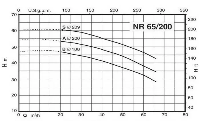 Линейный циркуляционный насос NR 65/200 S/A - это мощный фланцевый циркуляционный насос для систем отопления или водоснабжения. Перекачивает воду или гликолесодержащие жидкости в замкнутых системах. Патрубки насоса расположены в одну линию (inline исполнение). Производительность насоса NR 65/200 S/A колеблется от 21,0 до 66,0 кубометров в час (350,0 - 1100,0 литров в минуту), напор соответственно от 42,7 до 60,5 метров водяного столба. При этом оптимальная рабочая точка производительности 54,0 кубометра в час (900,0 литров в минуту) при давлении 49,5 метра водяного столба. Показатель КПД насоса в указанной точке 64%. Манометрическая высота всасывания около 7 м. Линейный насос NR 65/200 S/A оснащен индукционным 2-полюсным двигателем (n = 2900 оборотов в минуту), с номинальной мощностью 15,0 кВт (380 вольт) и силой тока соответственно 27,5 А.