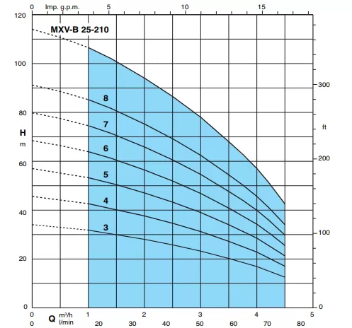 Насос Calpeda MXV-BM 25-205 - это вертикальный многоступенчатый насос высокого давления производства итальянского завода Calpeda. Насос имеет 5 рабочих ступеней. Резьбовые патрубки насоса одинакового диаметра расположены на одной линии. Корпус насоса и все внутренние элементы изготовлены из хромоникелевой нержавеющей стали AISI 304 (вал AISI 303). Предназначен для перекачивания воды и прочих жидкостей в системах водоснабжения и отопления. Производительность пятиступенчатого насоса MXV-BM 25-205 колеблется от 1 до 4,5 м3/час (от 16,6 до 75 л/мин.), а напор соответственно от 21,0 до 53,0 метров водяного столба. При этом оптимальная рабочая точка производительности 3,0 м3/ч (50 литров в минуту) при давлении 38,9 метров водяного столба. КПД насоса в указанной точке составляет около 37%.