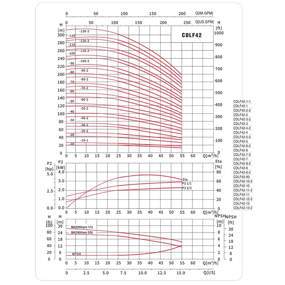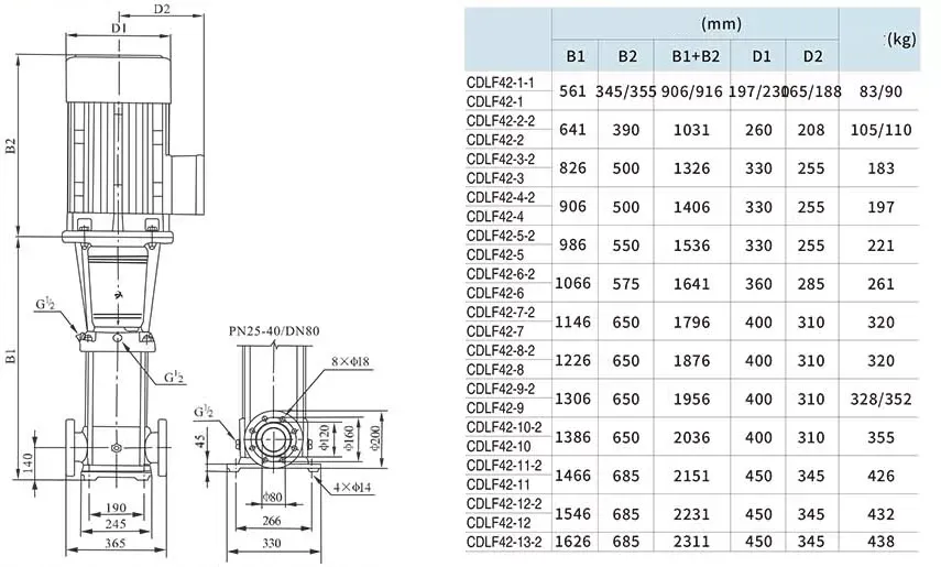 Вертикальный многоступенчатый насос MAXPUMP CDLF42-90 – многоступенчатые вертикальные центробежный насос, предназначенные для перекачивания чистых, невзрывоопасных, не агрессивных к нержавеющей стали жидкостей без абразивных твердых или волокнистых частиц. Максимальная производительность равна 55 м³/час, а максимальный напор 214 м. Вертикальный многоступенчатый насос MAXPUMP CDLF42-90 трехфазный, подключается к сети 380 В. Компоненты проточной части насоса выполнены из нержавеющей стали AISI304, станина насоса выполнена из чугуна.